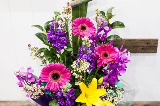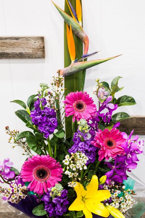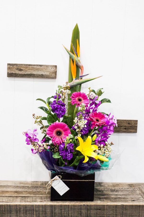 Bright, bold and beautiful this arrangement has everything in it! With flowers ranging from Stock, Orchids, Gerberas, Lilies and the shining star which is the Bird of Paradise.